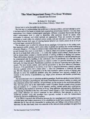 = The Most Important Essay I've Ever Written: A Recidivism Solution By Robert W. Warrington First printed in the Isthmus, February I March 2010 I know how to solve the recidivism problem ... The first...