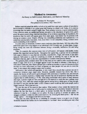 Method to Awesome: An Essay on Self-Control, Motivation, and Rational Morality By Robert W. Warrington First printed in the Isthmus, May I June 2012 Before mankind gained the ability to look at the earth from...