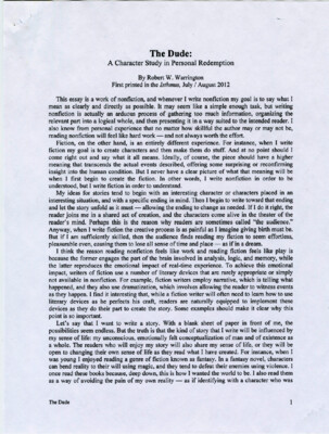 \ The Dude: A Character Study in Personal Redemption By Robert W. Warrington First printed in the Isthmus, July I August 2012 This essay is a work of nonfiction, and whenever I write nonfiction my...