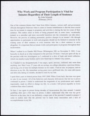 Why Work and Program Participation is Vital for Inmates Regardless of Their Length of Sentence By John Schmidt (February 2015) One of the common themes that I hear from fellow inmates, various staff, and government...