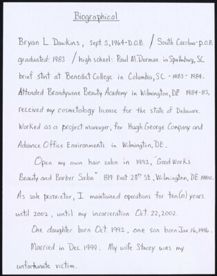 Biographical Bryan L. Dawkins, Sept. 5, 1964-D.O.B./ South Carolina-P.O.B. graduated: 1983/ high school: Paul M. Dorman in Spartanburg, SC brief stint at Benedict College in Columbia, SC-1983-1984. Attended Brandywine Beauty Academy in Wilmington, DE 1984-1985,...